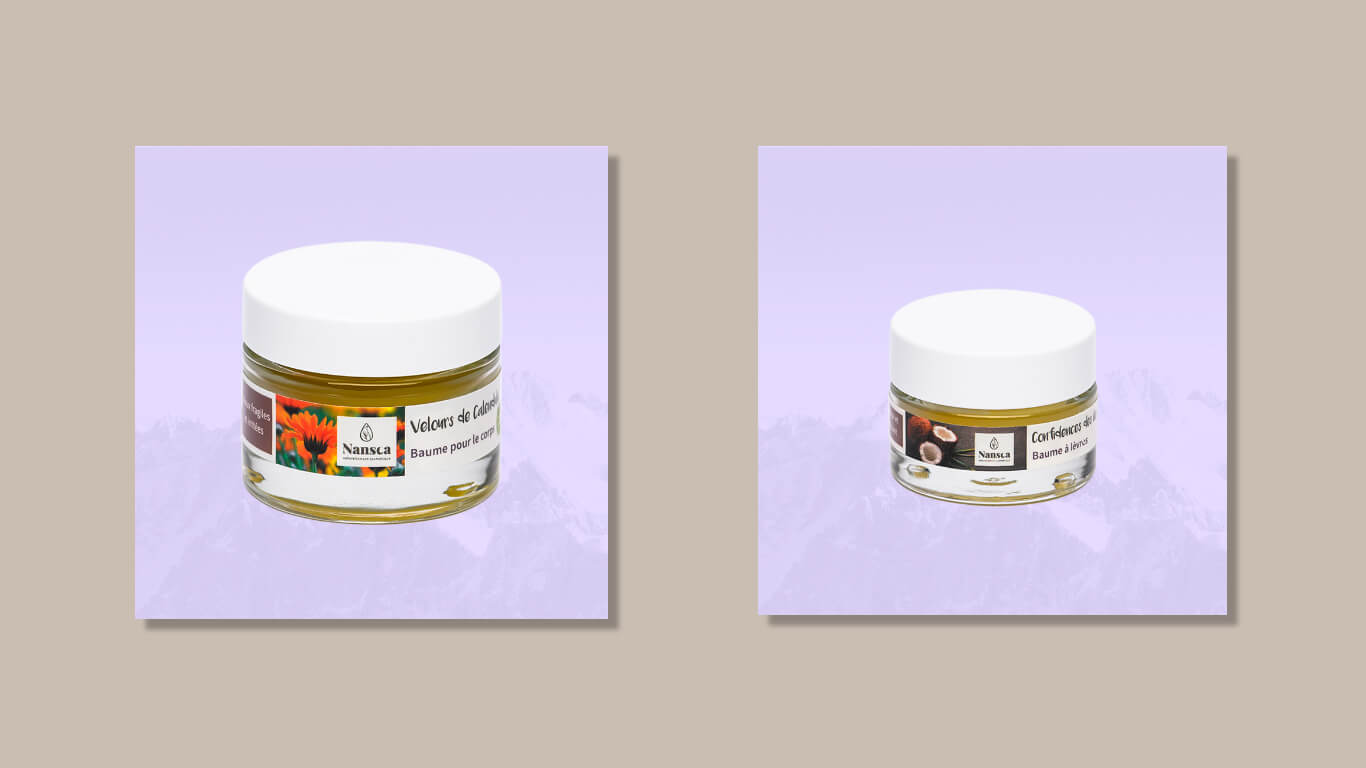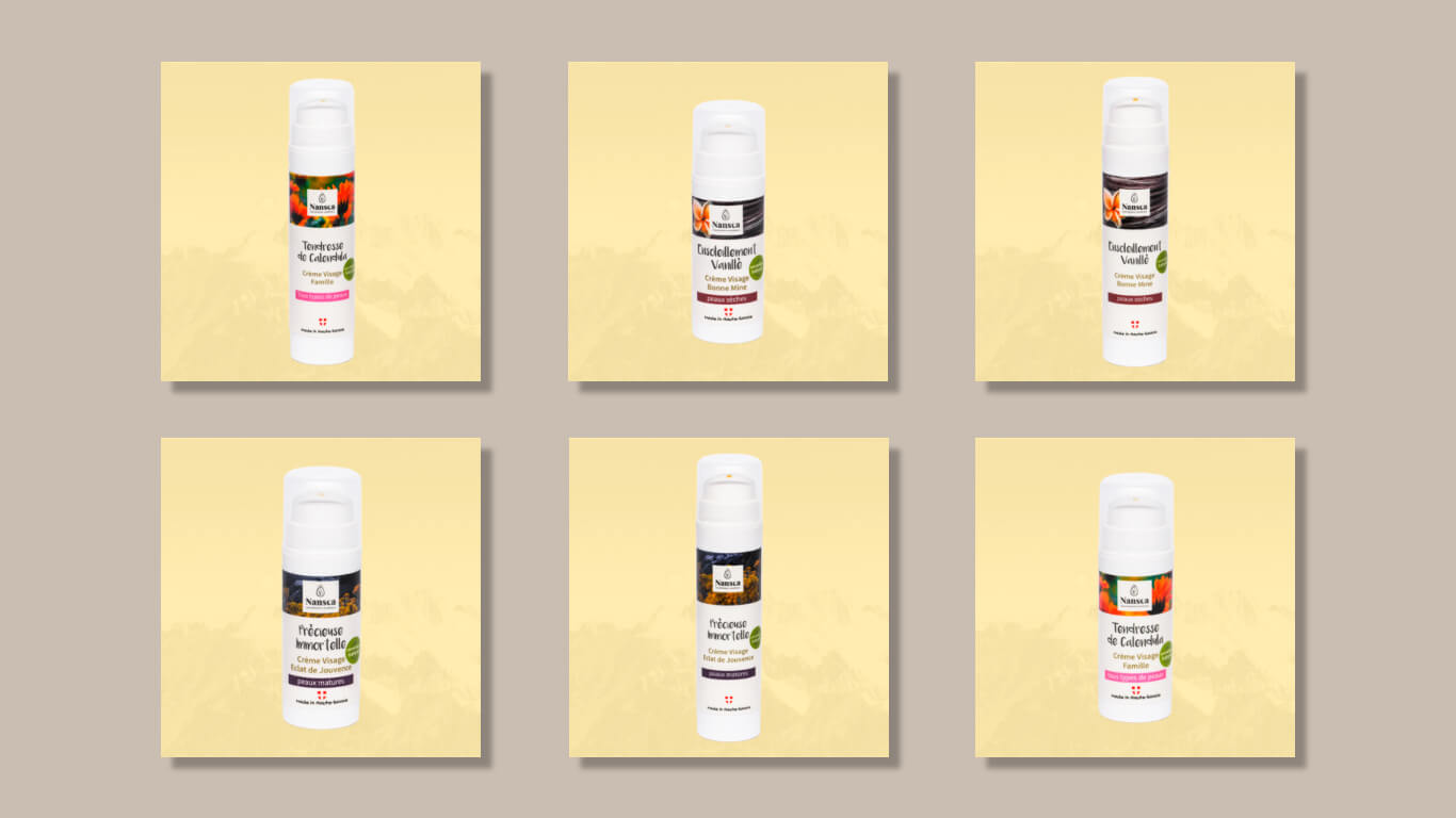 Notre direction créative s’est portée sur la construction d’une identité packaging valorisant le territoire géographique de la marque : la Haute-Savoie. Naturalité et authenticité, à l’image des produits Nansca. Le design des étiquettes fait la part belle aux superbes photos de végétaux constituant les ingrédients principaux des produits. Chaque nom a été pensé dans un esprit poétique, évoquant les sensations (tendresse, douceur, velours…) et une provenance invitant au voyage (Oasis, Iles…) ou à la découverte du végétal (calendula, aloe vera…).